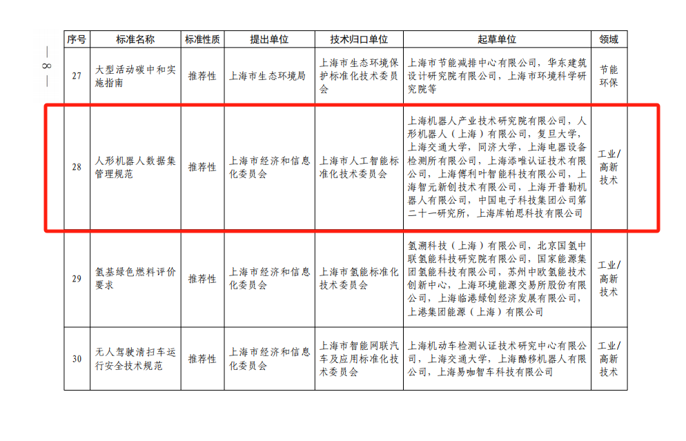 2024年12月19日沪市监标技〔2024〕527号,上海市市场监督管理局下达了关于《人形机器人数据集管理规范》上海市地方标准制修订项目计划的通知。