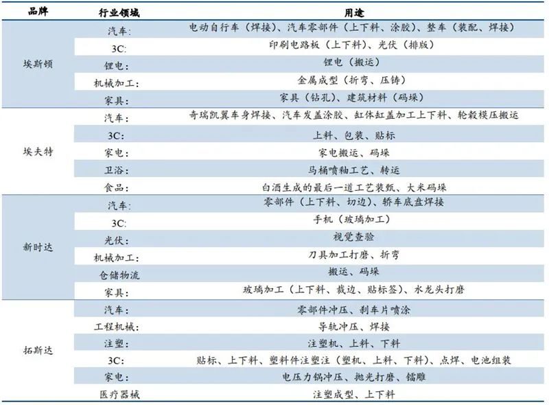 目前汽车行业仍为国内外工业机器人供应商下游主要的应用领域;其中海外品牌下游主要应用于汽车整车,国内品牌主要提供冲压、焊接、喷涂、包装等汽车行业细分领域的机器人产品。