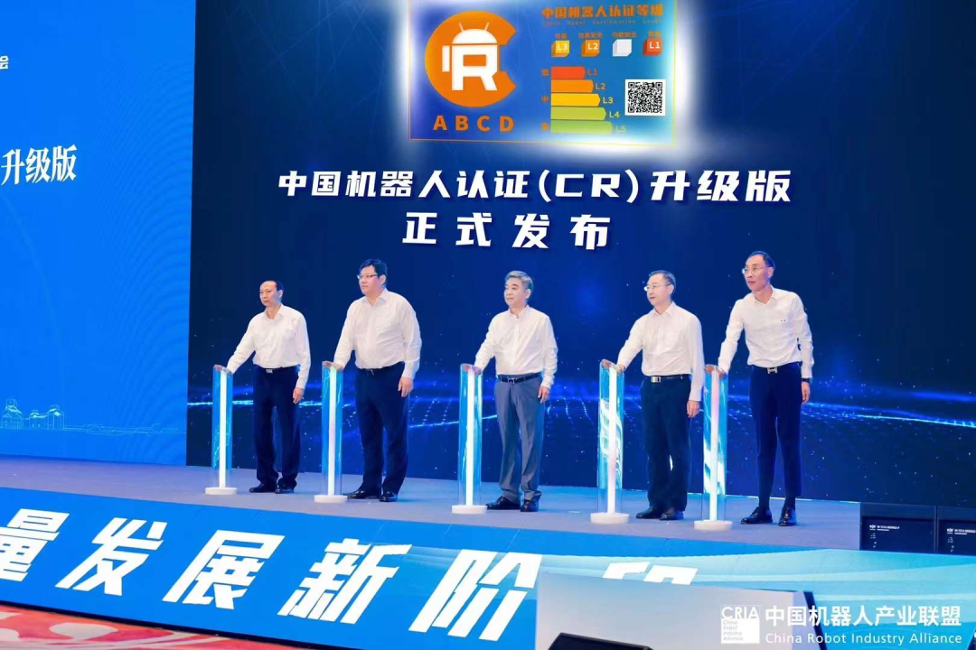2022年9月2日,在2022中国机器人产业发展大会上,由国家发改委产业司原司长年勇、国家市场监督总局认证监管司副司长李春江,工业和信息化部装备工业一司副司长汪宏、中国机器人产业联盟执行理事长宋晓刚、机器人检测认证联盟理事长吴业华共同启动,正式发布新版中国机器人认证(CR)升级版。