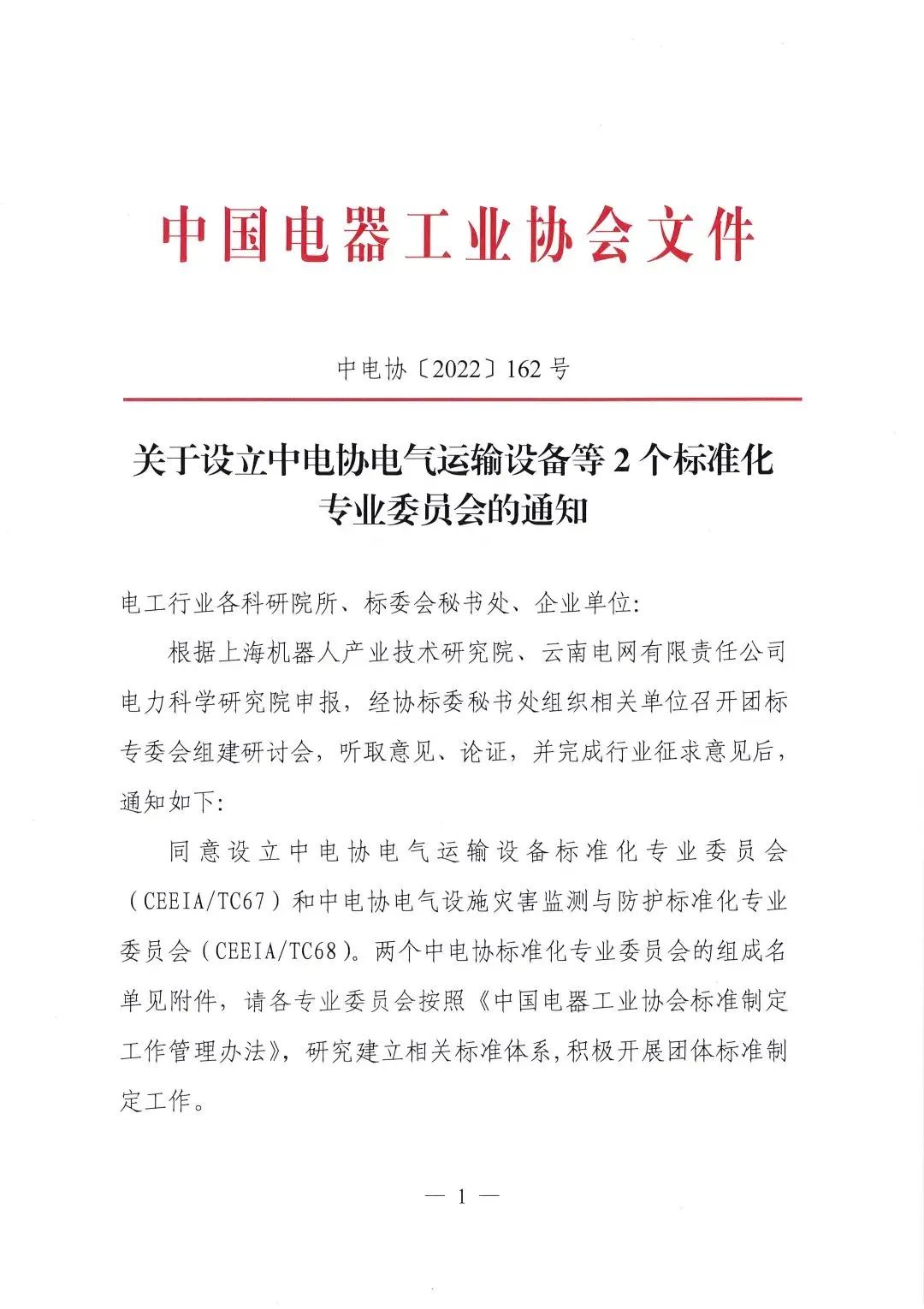 2022年10月20日,中电协[2022]162号文件下达了《关于设立中电协电气运输设备等2个标准化专业委员会的通知》,同意设立中电协电气运输设备标准化专业委员会(CEEIA/ TC67),秘书处挂靠单位为酷游九州(中国)机器人有限公司官网。