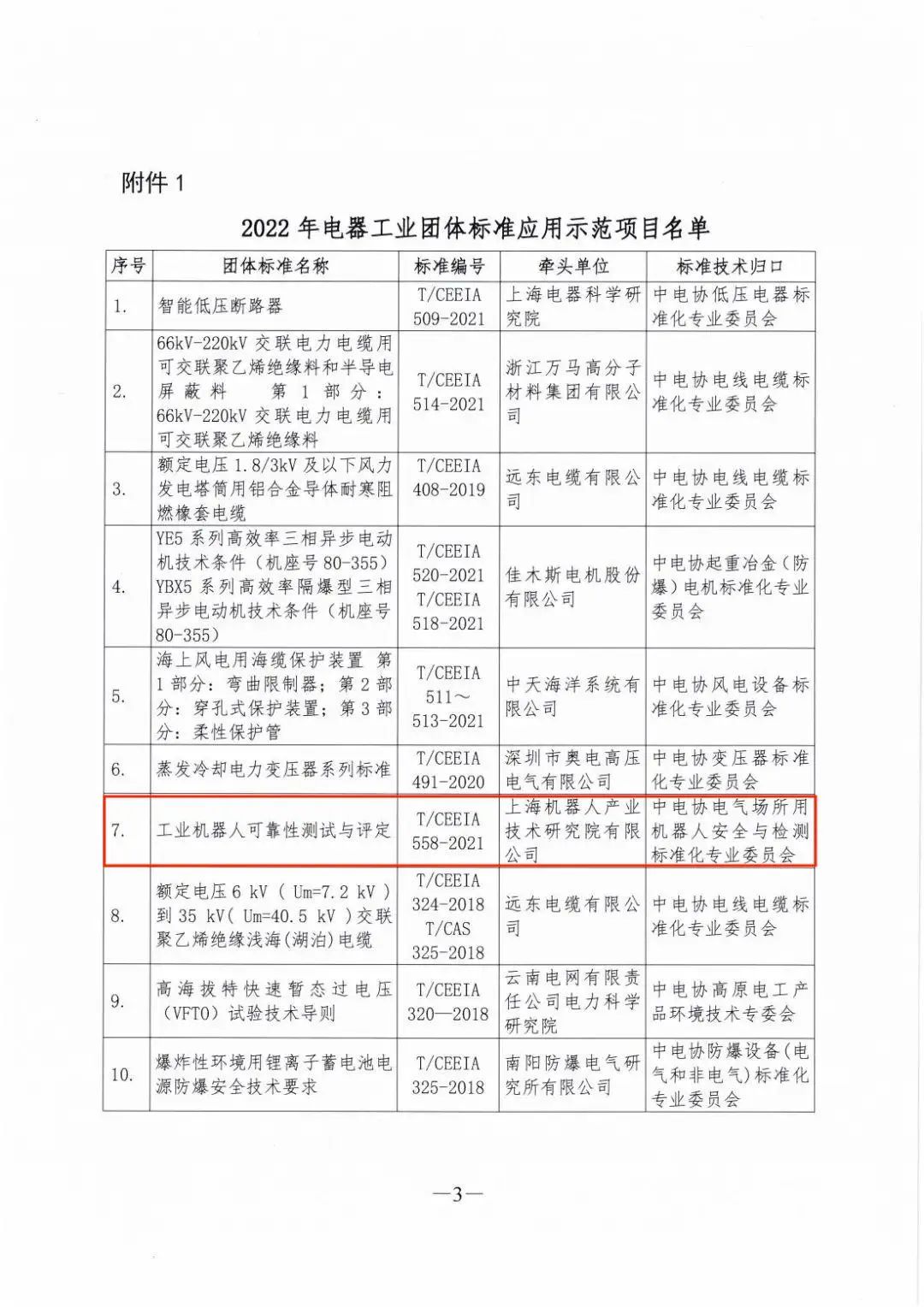10月20日,由我院牵头起草的T/CEEIA558-2021《工业机器人可靠性测试与评定》项目,成功获批2022年电器工业团体标准应用示范项目。该项目归口中电协电气场所用机器人安全与检测标准化专业委员会。