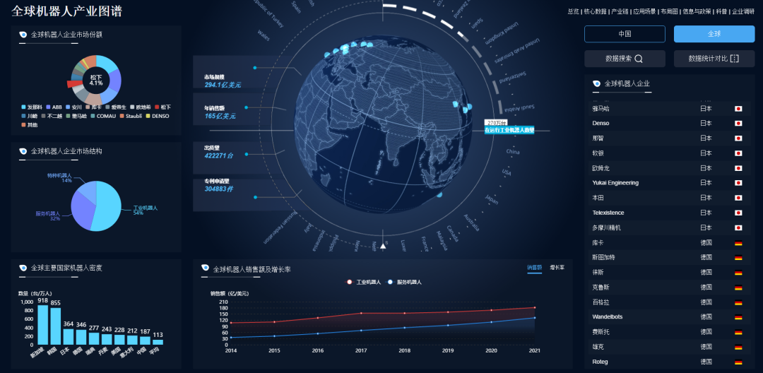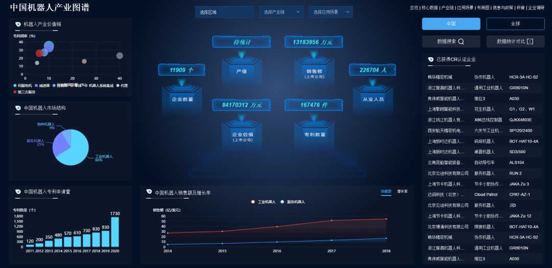 机器人产业图谱不仅涵盖了全球机器人产业宏观数据,覆盖核心机器人酷游九州企业市场份额占比、机器人市场结构、机器人销售额及增长率等系列宏观数据。而且展示了中国各省市机器人产业的详细情况,包含了机器人企业数量、专利数量、销售额、增长率、已获得CR认证企业数量等核心数据。