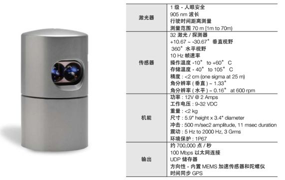 2、HDL-32E激光雷达传感器体积更小,更轻,结构坚固,有32个激光器,纵向视野 40°。HDL-32E 高为 5.7",直径 3.4",重量小于 2 公斤,适用于需求量日益增大的真实自主导航、3D 移动绘图及激光雷达相关应用。HDL-32E 创新的激光阵列可使系统观测到比其他激光雷达传感器更多的信息。 32个激光器组可以实现 +10° 到 -30°角度调节,可提供极好的垂直视野,更有持有专利的旋转头设计,水平视野可达 360°。 HDL-32E每秒可输出700000 像素,测量范围可达70m,一般精度可达 +/-2cm。