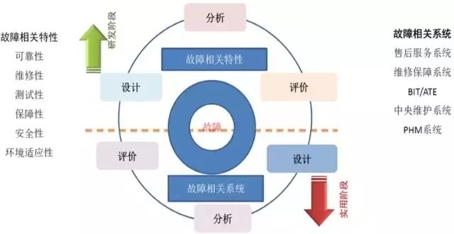 与故障相关的系统,则是指面向产品的使用维护和运维阶段,以前叫售后服务系统。没有经历过正向研发过程的时候,我们的解决方案当然是出了故障就要修好,这就是被动的维修服务,归到售后服务系统里,即使是售后服务系统也需要主动去设计。后来的维修保障系统、BIT、ATE、中央维护系统、远程维护系统、PHM故障预测与健康管理系统等,都属于与故障相关的系统,随着技术的发展,现在技术热点就是PHM系统。图3才是完整的针对故障的研发和设计,这个就是可靠性系统工程基本的理念。