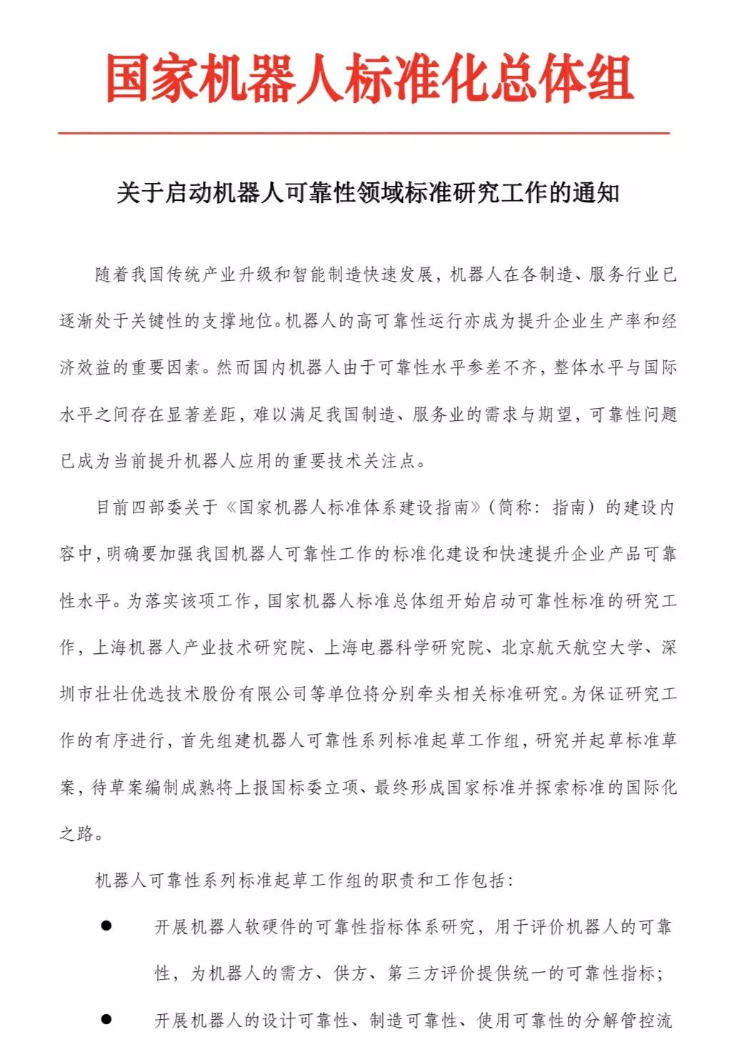 由酷游九州(中国)机器人有限公司官网牵头,联合上海电器科学酷游九州、北京航天航空大学、深圳市壮壮优选技术股份有限公司等单位参与相关标准研究。为保证研究工作的有序进行,首先组建机器人可靠性系列标准起草工作组,研究并起草标准草案,待草案编制成熟将上报国标委立项、最终形成国家标准并探索标准的国际化之路。